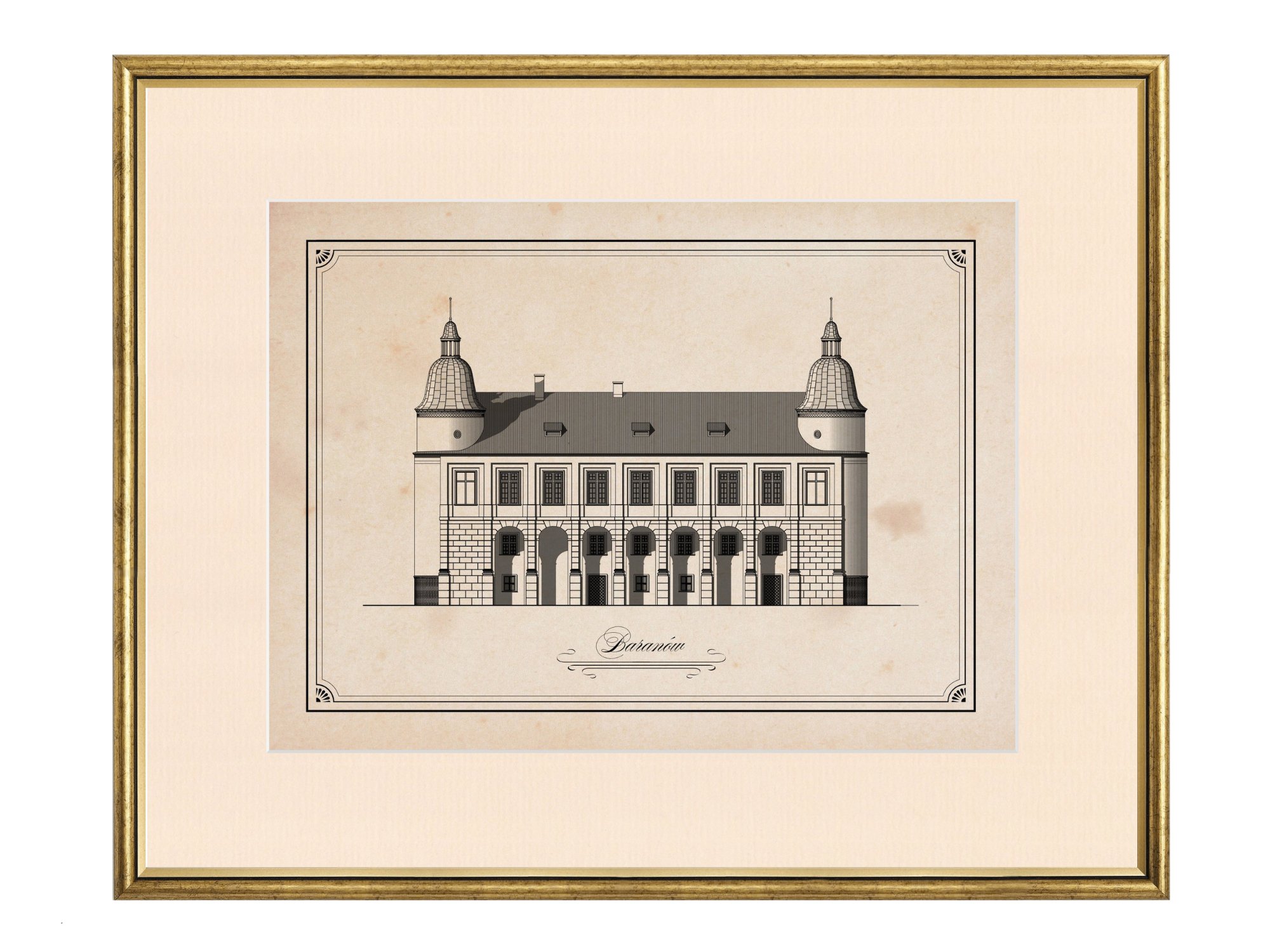Ta wyjątkowa grafika przedstawia Zamek w Baranowie Sandomierskim, nazywany także „Małym Wawelem”, który znajduje się w sercu Podkarpacia, nad brzegiem Wisły. Budynek został wzniesiony w drugiej połowie XVI wieku z inicjatywy Rafała Leszczyńskiego, w miejscu wcześniejszego, gotyckiego dworu obronnego należącego do rodziny Baranowskich. Wykonanie projektu powierzono wybitnemu włoskiemu architektowi Santiemu Gucciemu, nadwornemu artyście Stefana Batorego i Anny Jagiellonki. To właśnie jemu zawdzięczamy harmonijne połączenie włoskiego renesansu z polską tradycją magnackich rezydencji. Elewacja frontowa, wiernie odwzorowana na grafice, zachwyca finezją detali, od eleganckich arkad, przez balustrady i krużganki, po charakterystyczne cylindryczne baszty. To nie tylko dekoracja, to opowieść o historii, sztuce i wielkości dawnego rodu Leszczyńskich.