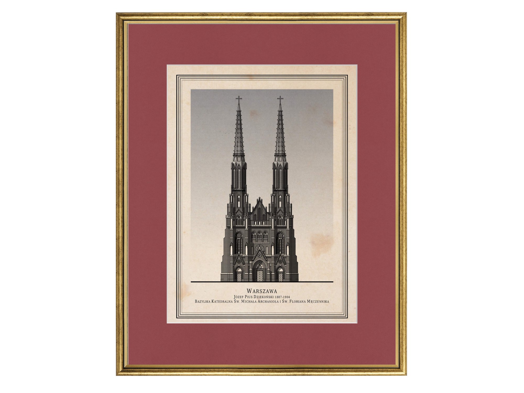 Grafika przedstawia frontową elewację Bazyliki Katedralnej św. Michała Archanioła i św. Floriana Męczennika w Warszawie, jednej z najważniejszych świątyń prawobrzeżnej części miasta i dominantę architektoniczną warszawskiej Pragi.