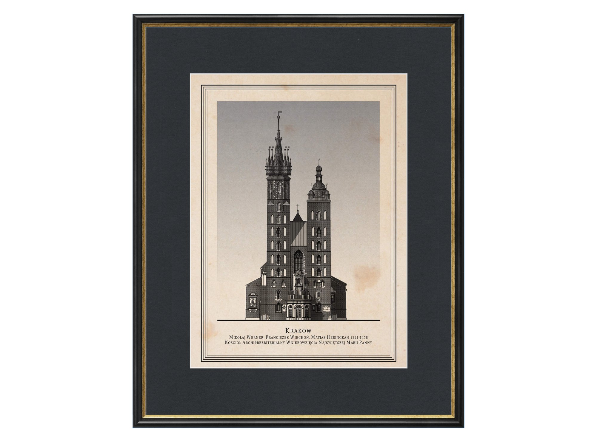 Ilustracja przedstawia frontową elewację Kościoła Archiprezbiterialnego Wniebowzięcia Najświętszej Marii Panny w Krakowie, znanego jako Kościół Mariacki, jednego z najważniejszych zabytków architektury sakralnej w Polsce i symbolu krakowskiego Rynku Głównego.