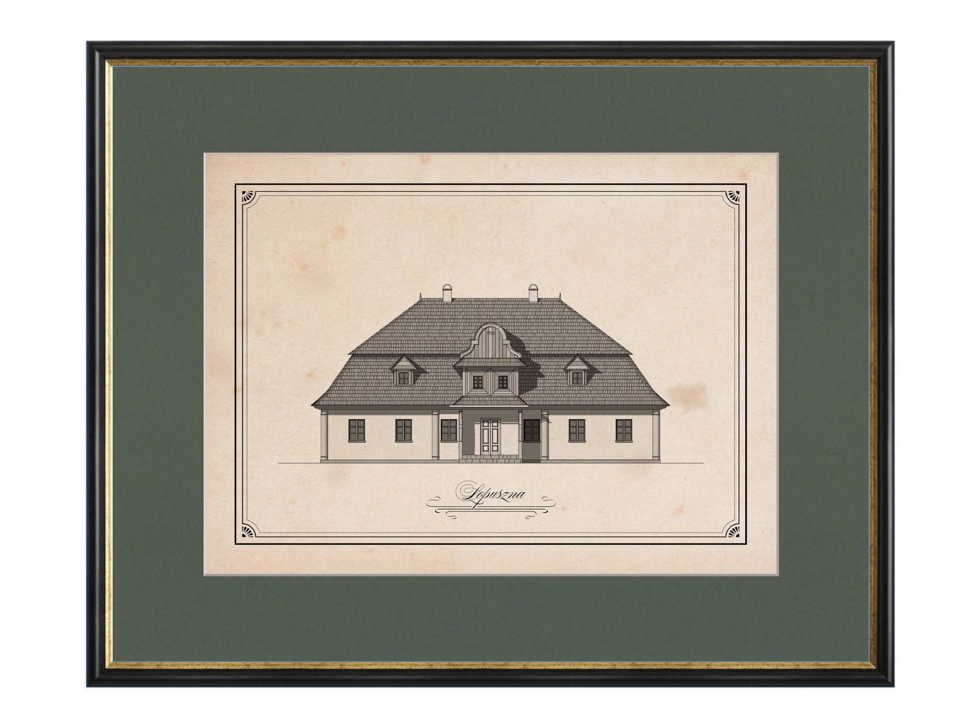 Grafika przedstawia elewację frontową XVIII-wiecznego dworku w Łopusznej -klasycznego przykładu wiejskiej rezydencji szlacheckiej. Budynek został wzniesiony przez Romualda Lisickiego pomiędzy rokiem 1787, a 1790.